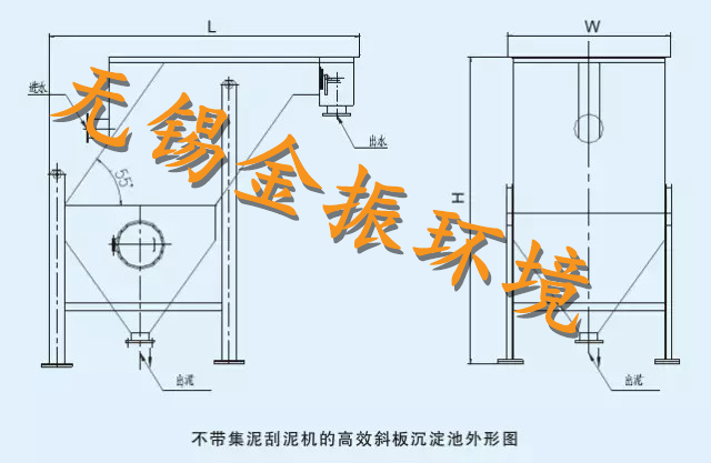 此類普通高效斜板沉淀池不含刮泥機(jī),適用于污水中污泥負(fù)荷較小,污泥沉降性能好的水質(zhì)。污泥通過(guò)下端泥斗濃縮后排出。