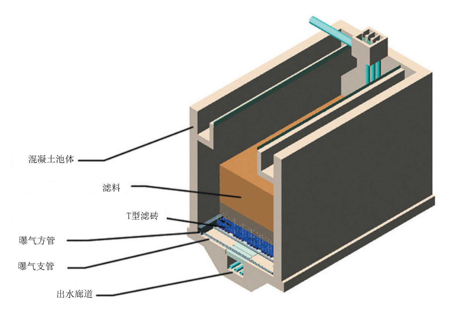 濾池底部設(shè)有進(jìn)水和排泥管,中上部是填料層,厚度一般為2.5~3.5m,為防止濾料流失,濾床上方設(shè)置裝有濾頭的混凝土擋板,濾頭可從板面拆下,不用排空濾床,方便維修。擋板上部空間用作反沖洗水的儲水區(qū),其高度根據(jù)反沖洗水頭而定。