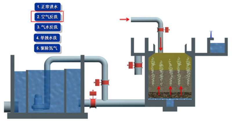 開啟反沖洗空氣閥,通過底部布?xì)庀到y(tǒng)向濾料層通入空氣,利用空氣的攪拌作用,使濾料顆粒相互摩擦、碰撞,松動濾料層,將附著在濾料表面的污泥、老化生物膜初步剝離,此階段一般持續(xù) 3-5 分鐘。