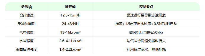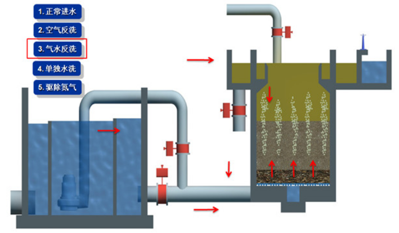 在持續(xù)氣沖的同時,開啟反沖洗水閥,通過底部布水系統(tǒng)通入反沖洗水。氣、水共同作用下,進(jìn)一步強化濾料的擾動和摩擦效果,將剝離的污染物沖刷懸浮于水中,此階段通常持續(xù) 4-6 分鐘。