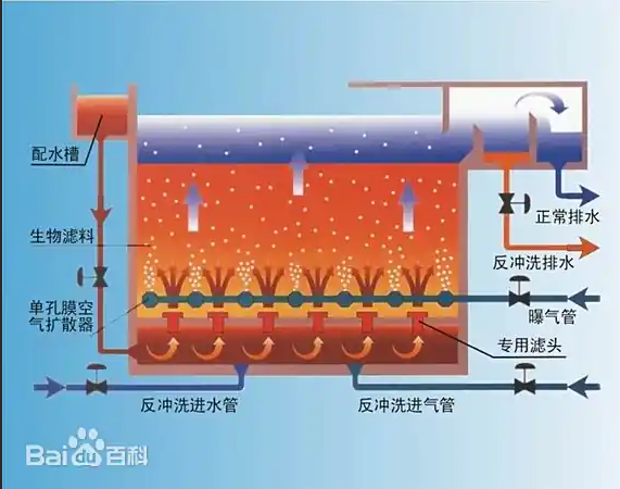 概述:曝氣生物濾池是一種將生物氧化和截留懸浮固體結(jié)合于一體的生物膜法污水處理工藝,濾池中填充有高比表面積的濾料,微生物在濾料表面形成生物膜,通過曝氣提供氧氣,對污水進(jìn)行凈化。