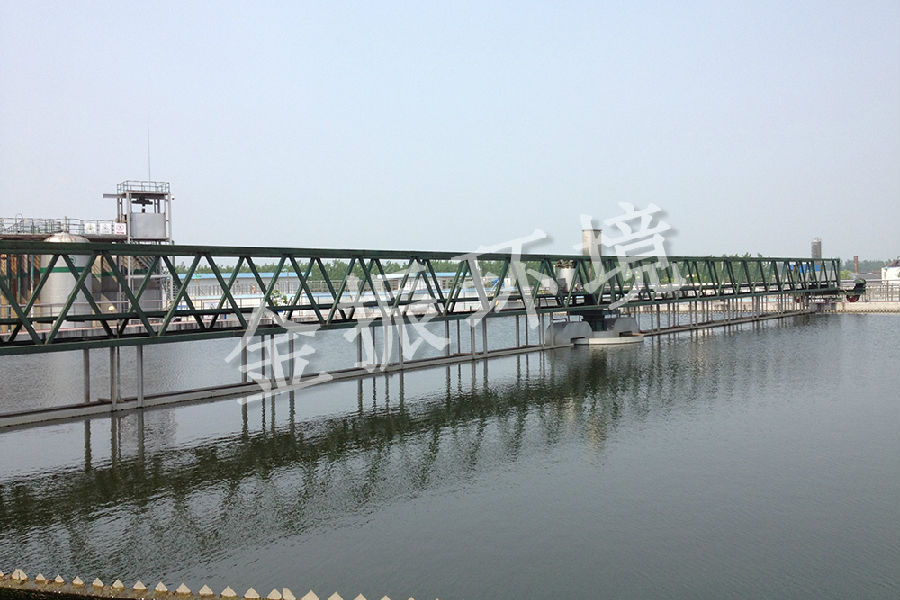 全橋式周邊傳動吸泥機適用于污水處理廠幅流式二次沉淀池。其主要功能是將沉降在池底的污泥刮集至一組半徑方向布置的吸泥管管口,再通過中心排泥管排出,以便污泥回流或濃縮脫水。視情況需要,還可以設(shè)置池面刮渣機構(gòu),收集池面浮渣并通過浮渣漏斗排出池外。